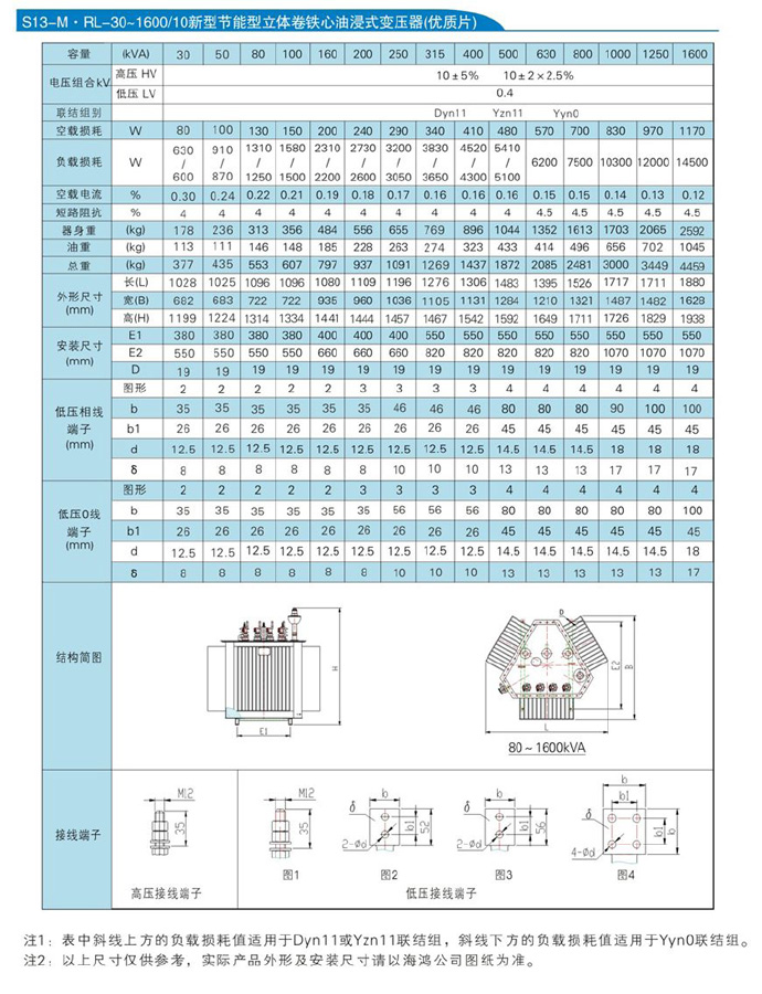 华盈S13-M.RL系列10kV 三相油浸式卷铁芯双绕组无励磁调压配电变压器技术参数: